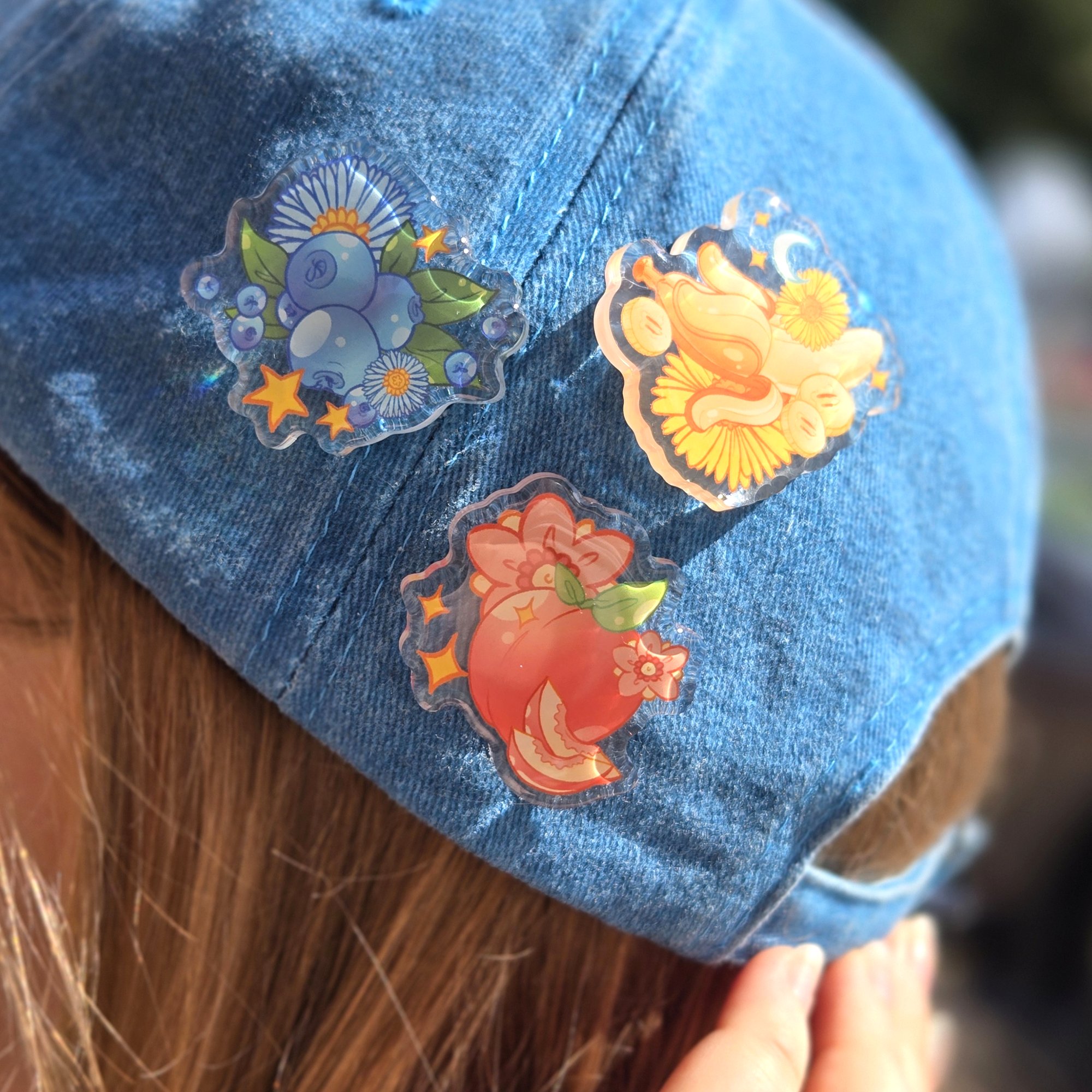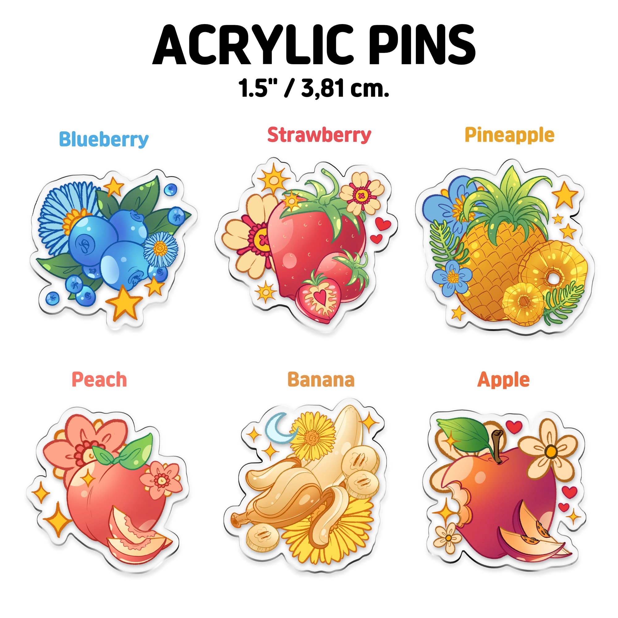 Cute acrylic 1.5" pins with an epoxy finish on the front. Designs of Peaches, Blueberries, Strawberries, Banana's, Apples & Pineapples!